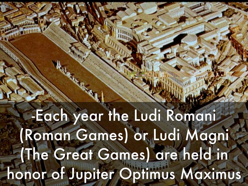 -Each year the Ludi Romani (Roman Games) or Ludi Magni (The Great Games) are held in honor of Jupiter Optimus Maximus