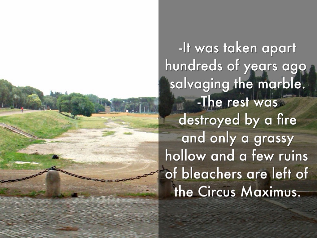 -The rest was destroyed by a fire and only a grassy hollow and a few ruins of bleachers are left of the Circus Maximus.
