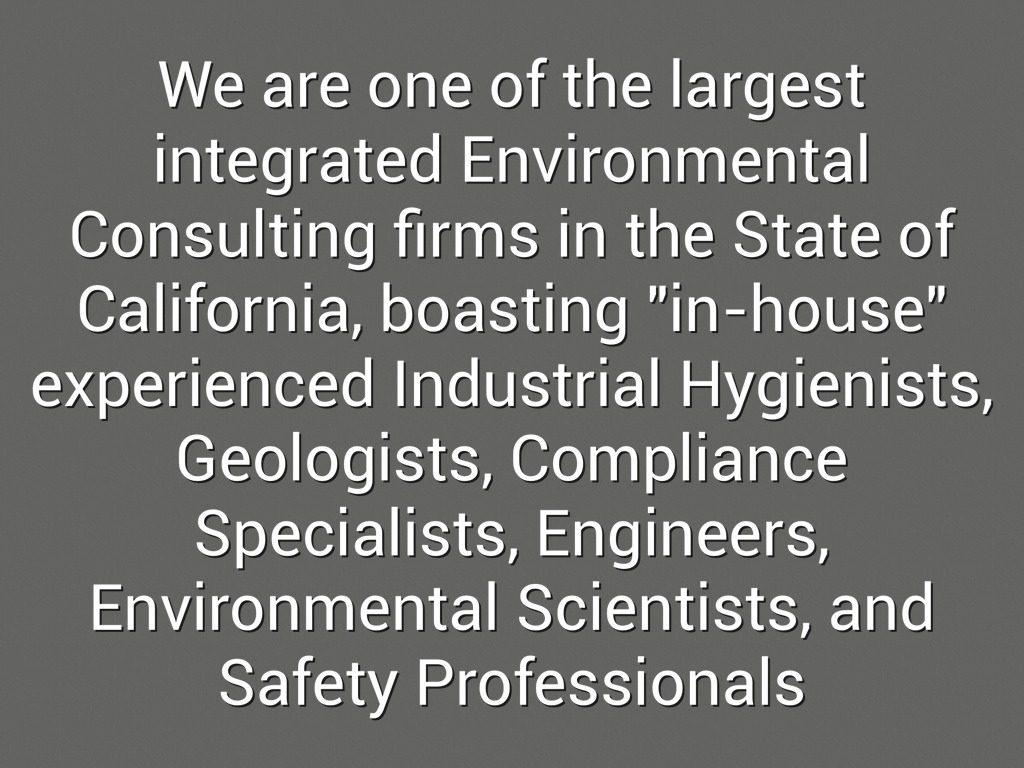We are one of the largest integrated Environmental Consulting firms in the State of California, boasting "in-house" experienced Industrial Hygienists, Geologists, Compliance Specialists, Engineers, Environmental Scientists, and Safety Professionals