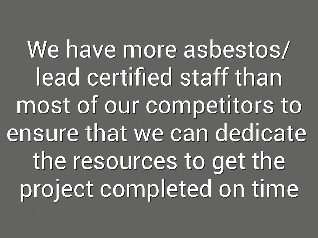 We have more asbestos/lead certified staff than most of our competitors to ensure that we can dedicate the resources to get the project completed on time