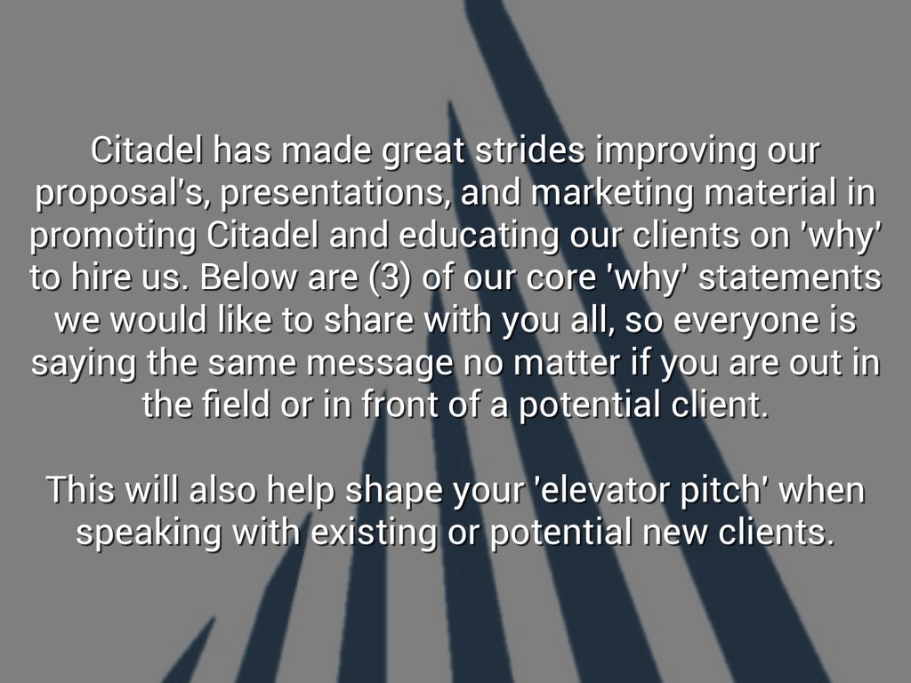 Citadel has made great strides improving our proposal's, presentations, and marketing material in promoting Citadel and educating our clients on 'why' to hire us. Below are (3) of our core 'why' statements we would like to share with you all, so everyone is saying the same message no matter if you are out in the field or in front of a potential client.