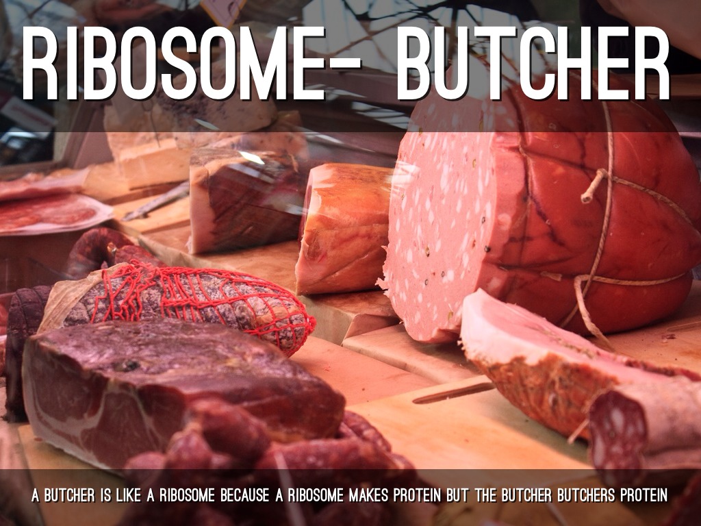 A BUTCHER IS LIKE A RIBOSOME BECAUSE A RIBOSOME MAKES PROTEIN BUT THE BUTCHER BUTCHERS PROTEIN