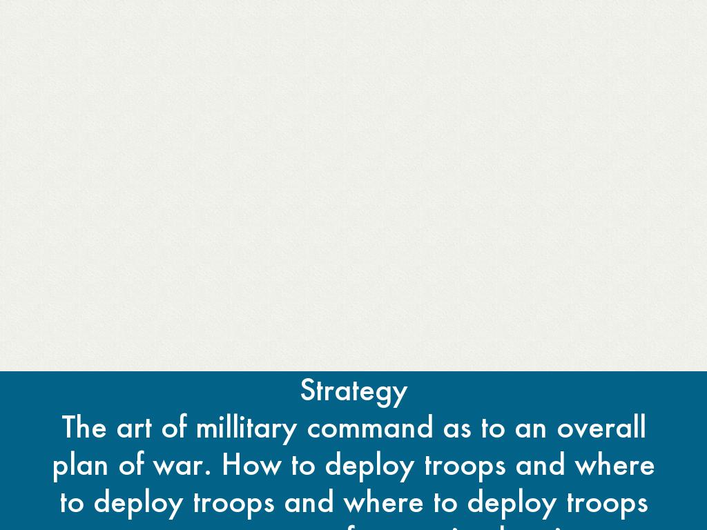 The art of millitary command as to an overall plan of war. How to deploy troops and where to deploy troops and where to deploy troops are commponets of strategic planning.