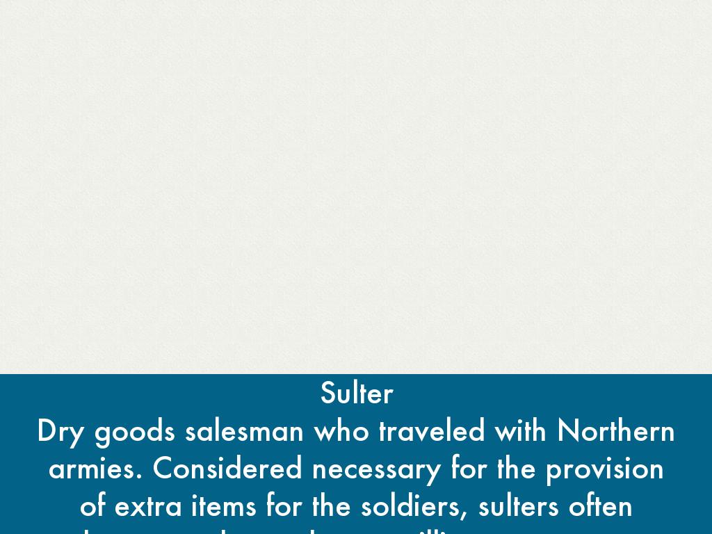 Dry goods salesman who traveled with Northern armies. Considered necessary for the provision of extra items for the soldiers, sulters often cheater and overcharge millitary custemers.