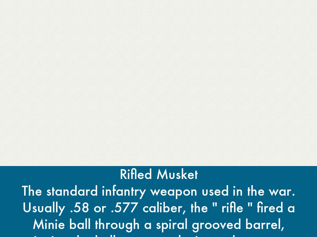 The standard infantry weapon used in the war. Usually .58 or .577 caliber, the " rifle " fired a Minie ball through a spiral grooved barrel, spinning the bullet more velocity and accuracy.