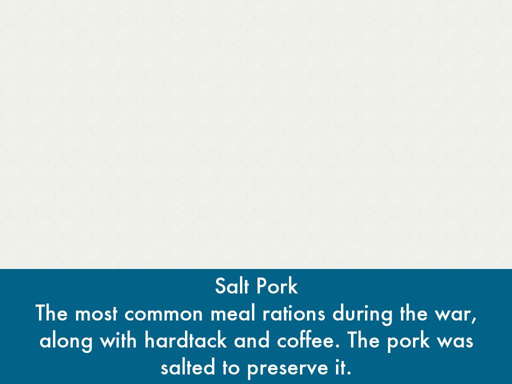 The most common meal rations during the war, along with hardtack and coffee. The pork was salted to preserve it.