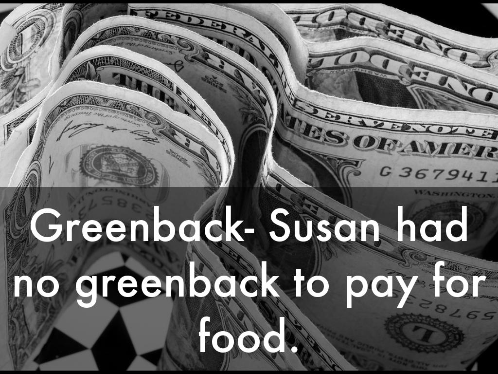 Greenback- Susan had no greenback to pay for food.