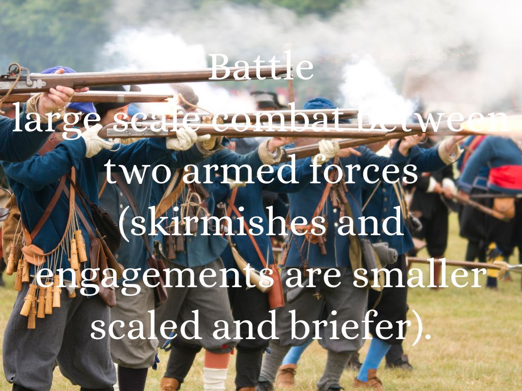 large scale combat between two armed forces (skirmishes and engagements are smaller scaled and briefer).