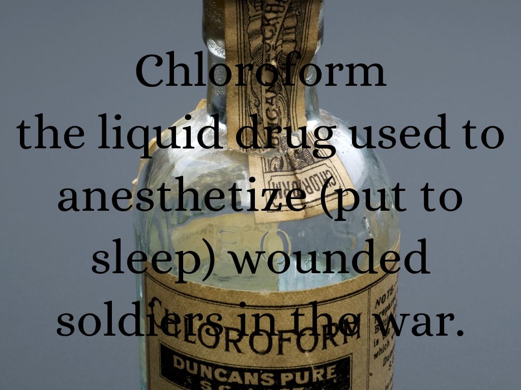 the liquid drug used to anesthetize (put to sleep) wounded soldiers in the war.