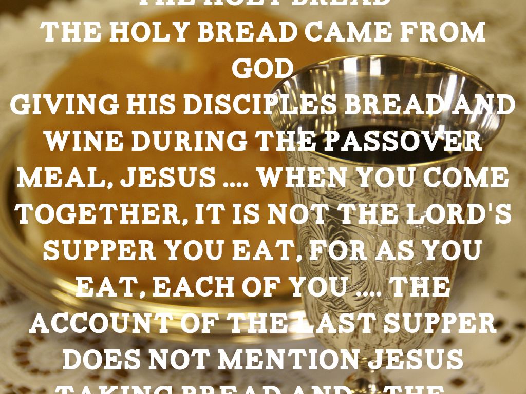 Giving his disciples bread and wine during the Passover meal, Jesus .... When you come together, it is not the Lord's Supper you eat, for as you eat, each of you .... the account of the Last Supper does not mention Jesus taking bread and "the ...