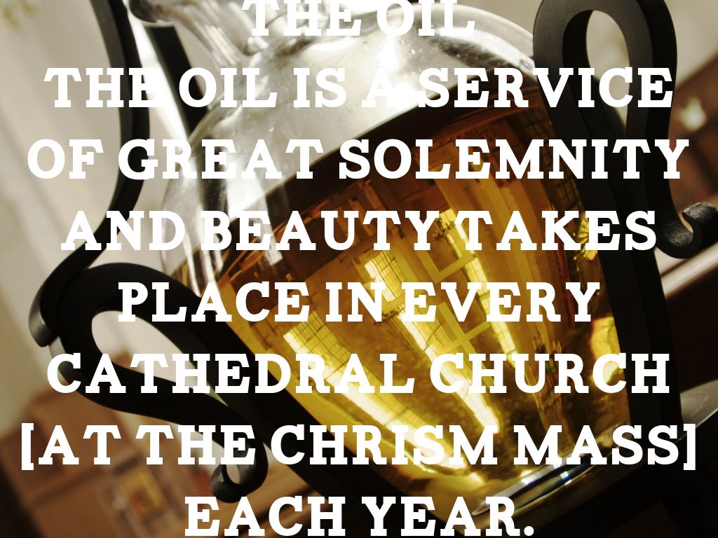 The oil is A SERVICE of great solemnity and beauty takes place in every cathedral church [at the chrism mass] each year.