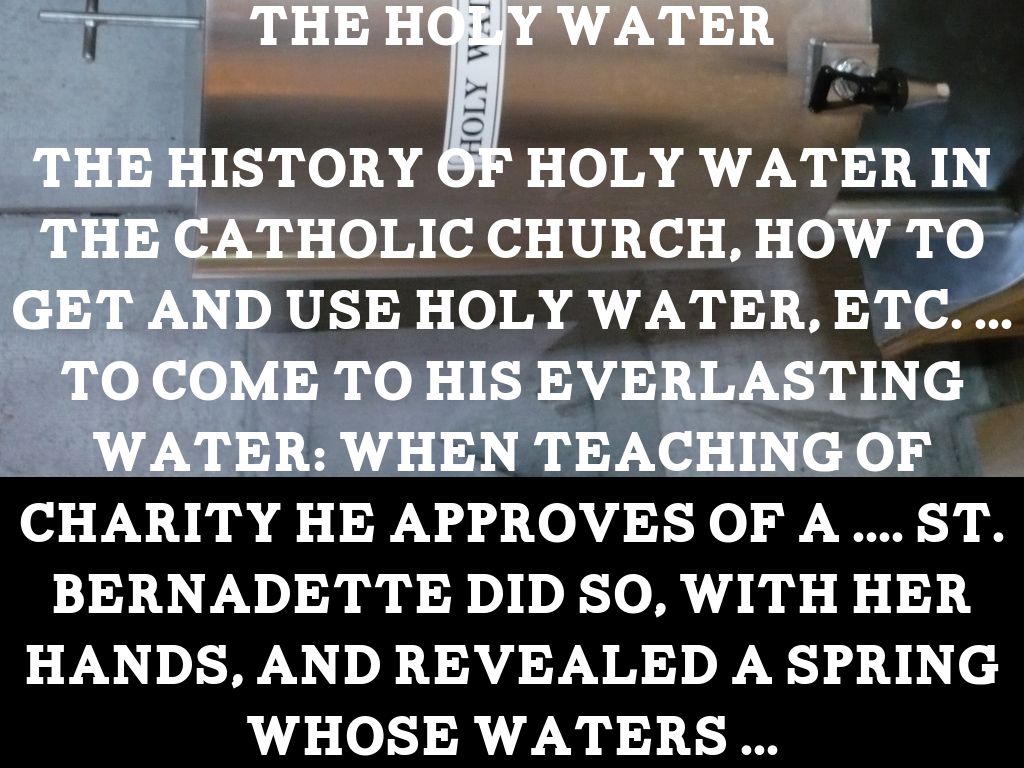 The history of holy water in the Catholic Church, how to get and use holy water, etc. ... to come to His everlasting water: when teaching of charity He approves of a .... St. Bernadette did so, with her hands, and revealed a spring whose waters ...