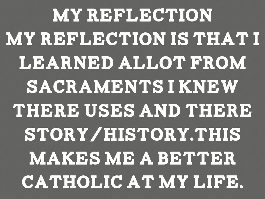 My reflection is that I learned allot from sacraments i knew there uses and there story/history.this makes me a better catholic at my life.