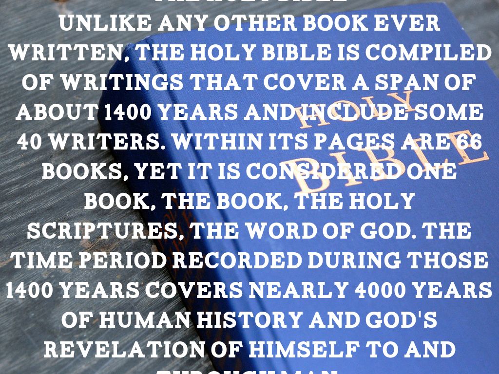 Unlike any other book ever written, the Holy Bible is compiled of writings that cover a span of about 1400 years and include some 40 writers. Within its pages are 66 books, yet it is considered one book, The Book, The Holy Scriptures, The Word of God. The time period recorded during those 1400 years covers nearly 4000 years of human history and God's revelation of Himself to and through man.