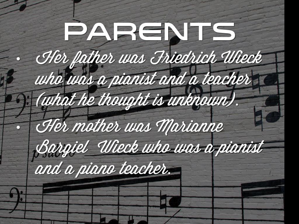 Her siblings were: Adelheid Wieck-S , Freidrich Wieck-B, Gustav Wieck-B, Victor Wieck-B. Half siblings: Clemens Wieck-HB, Marie Wieck-HS, Cäcillie Wieck-HS. Step siblings: Woldemer Bargiel-SB, Ernest Bargiel-SB, Clementine Bargiel-SS, Cäcillie Bargiel-SS.