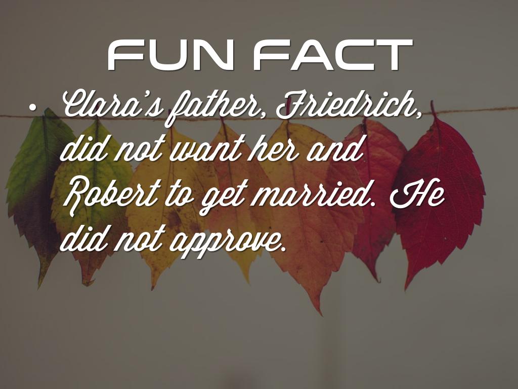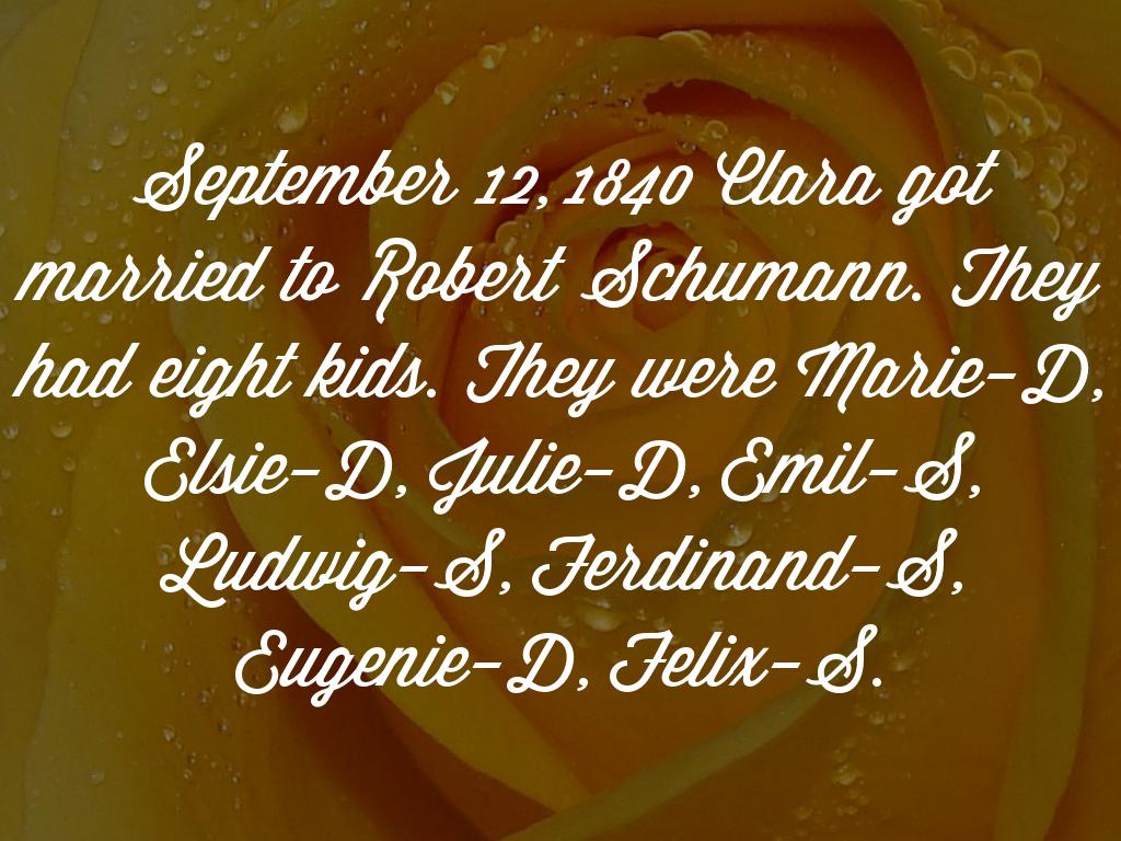 September 12, 1840 Clara got married to Robert Schumann. They had eight kids. They were Marie-D, Elsie-D, Julie-D, Emil-S, Ludwig-S, Ferdinand-S, Eugenie-D, Felix-S.