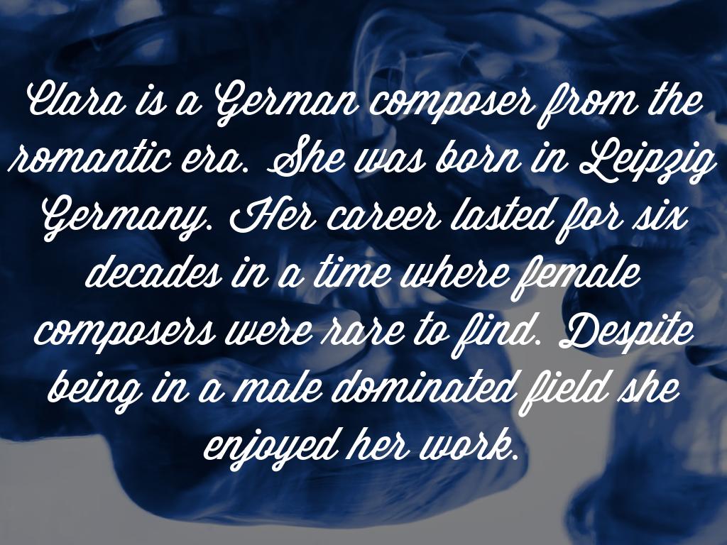 Clara is a German composer from the romantic era. She was born in Leipzig Germany. Her career lasted for six decades in a time where female composers were rare to find. Despite being in a male dominated field she enjoyed her work.