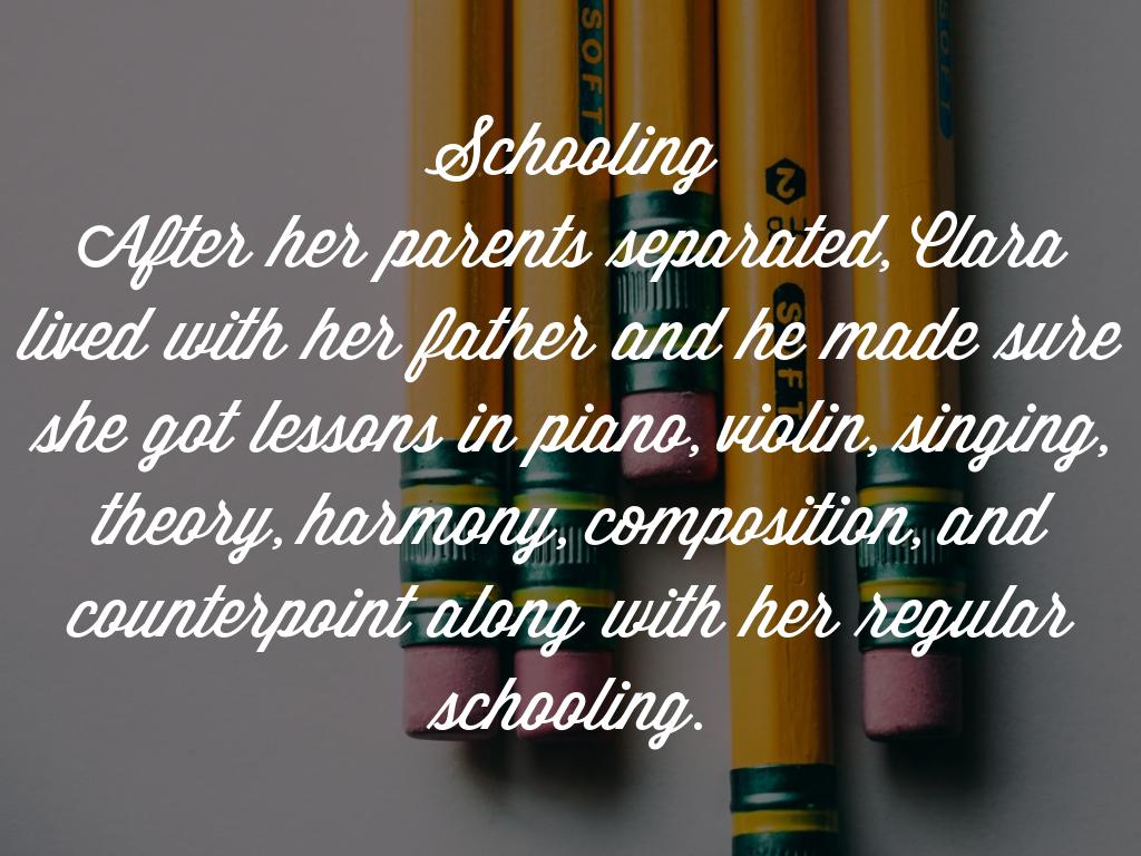 Schooling After her parents separated, Clara lived with her father and he made sure she got lessons in piano, violin, singing, theory, harmony, composition, and counterpoint along with her regular schooling.