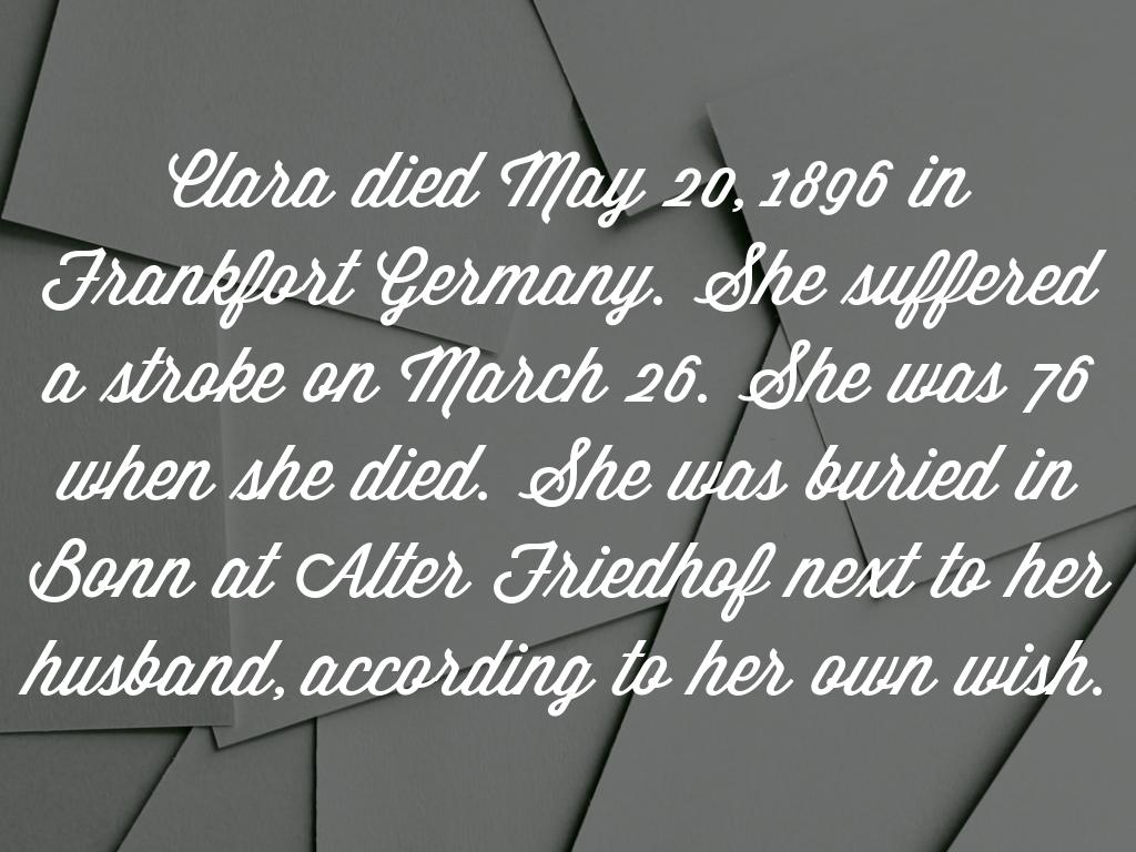 Clara died May 20, 1896 in Frankfort Germany. She suffered a stroke on March 26. She was 76 when she died. She was buried in Bonn at Alter Friedhof next to her husband, according to her own wish.