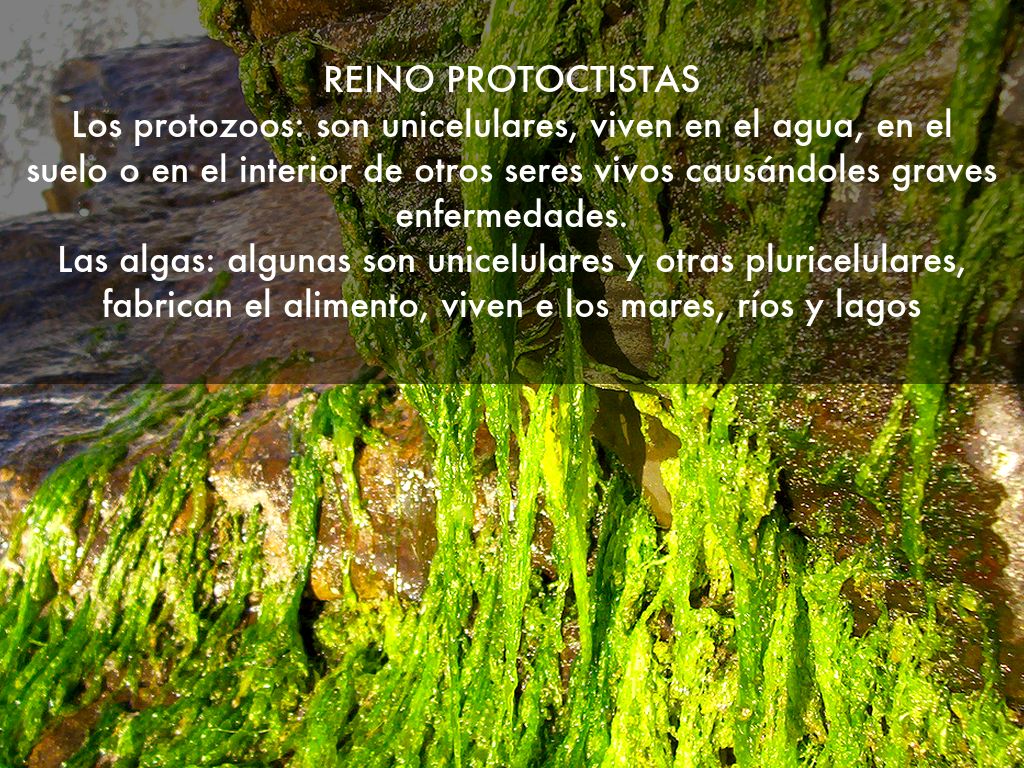 REINO PROTOCTISTAS Los protozoos: son unicelulares, viven en el agua, en el suelo o en el interior de otros seres vivos causándoles graves enfermedades. Las algas: algunas son unicelulares y otras pluricelulares, fabrican el alimento, viven e los mares, ríos y lagos