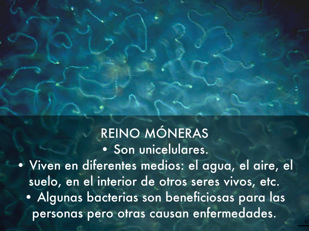 REINO MÓNERAS • Son unicelulares. • Viven en diferentes medios: el agua, el aire, el suelo, en el interior de otros seres vivos, etc. • Algunas bacterias son beneficiosas para las personas pero otras causan enfermedades.