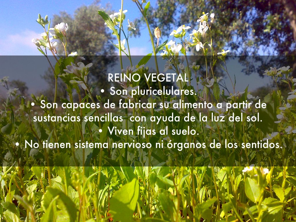 REINO VEGETAL • Son pluricelulares. • Son capaces de fabricar su alimento a partir de sustancias sencillas con ayuda de la luz del sol. • Viven fijas al suelo. • No tienen sistema nervioso ni órganos de los sentidos.