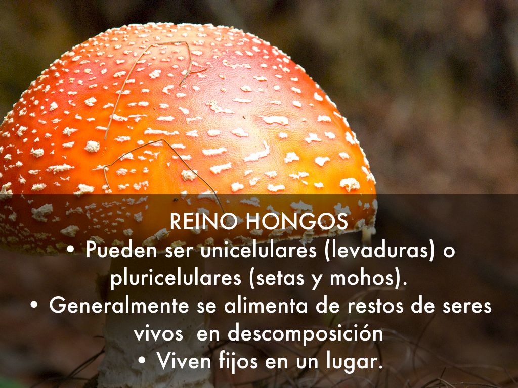 REINO HONGOS • Pueden ser unicelulares (levaduras) o pluricelulares (setas y mohos). • Generalmente se alimenta de restos de seres vivos en descomposición • Viven fijos en un lugar.