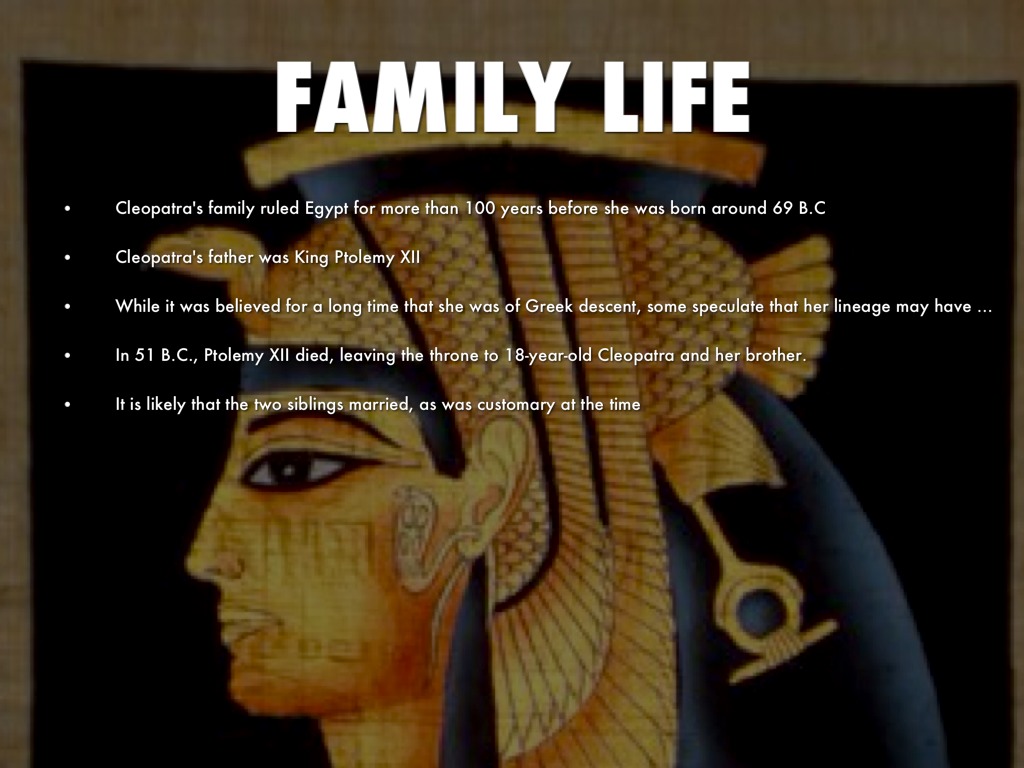 • Cleopatra's family ruled Egypt for more than 100 years before she was born around 69 B.C