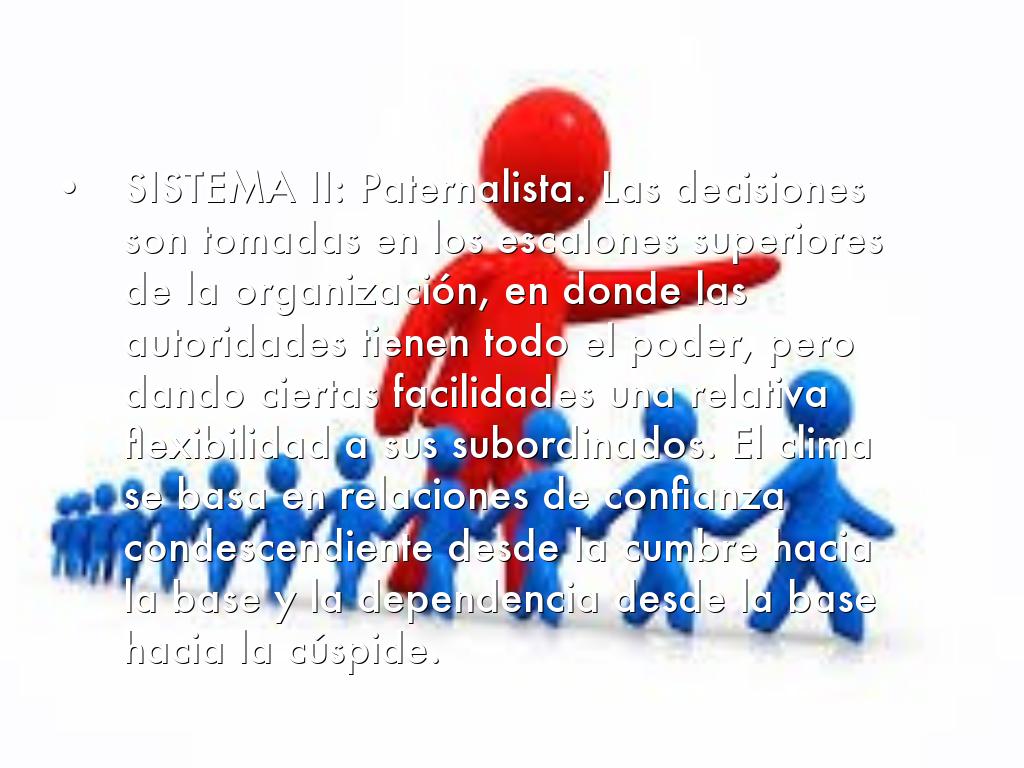 SISTEMA II: Paternalista. Las decisiones son tomadas en los escalones superiores de la organización, en donde las autoridades tienen todo el poder, pero dando ciertas facilidades una relativa flexibilidad a sus subordinados. El clima se basa en relaciones de confianza condescendiente desde la cumbre hacia la base y la dependencia desde la base hacia la cúspide.