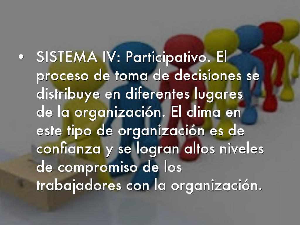 SISTEMA IV: Participativo. El proceso de toma de decisiones se distribuye en diferentes lugares de la organización. El clima en este tipo de organización es de confianza y se logran altos niveles de compromiso de los trabajadores con la organización.