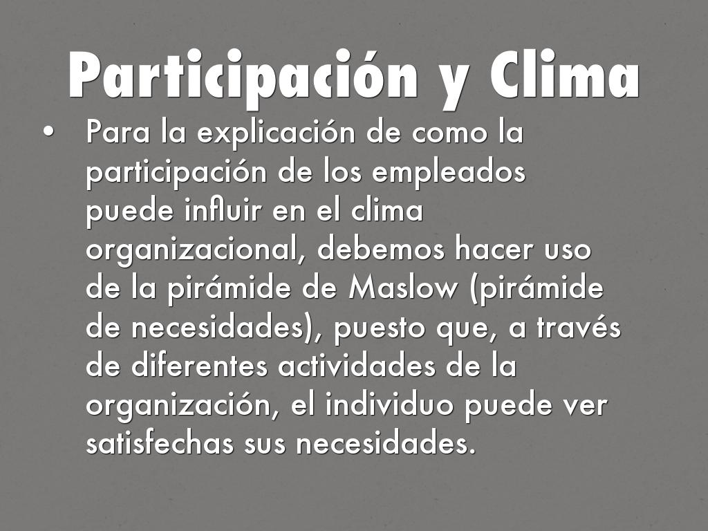 - Para la explicación de como la participación de los empleados puede influir en el clima organizacional, debemos hacer uso de la pirámide de Maslow (pirámide de necesidades), puesto que, a través de diferentes actividades de la organización, el individuo puede ver satisfechas sus necesidades.
