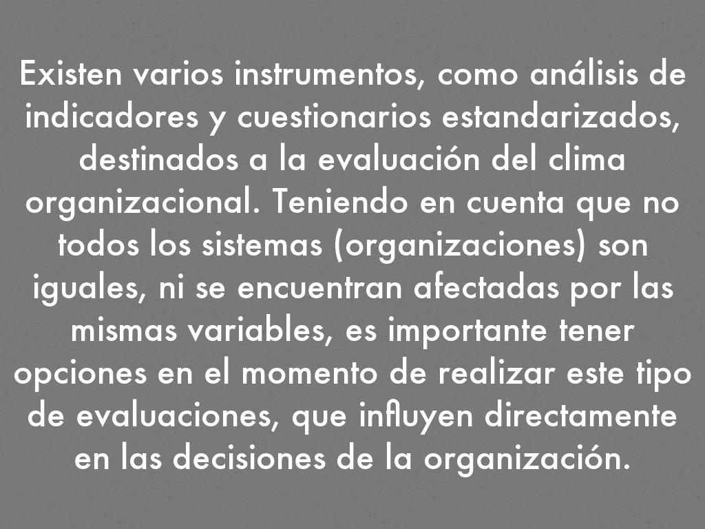Existen varios instrumentos, como análisis de indicadores y cuestionarios estandarizados, destinados a la evaluación del clima organizacional. Teniendo en cuenta que no todos los sistemas (organizaciones) son iguales, ni se encuentran afectadas por las mismas variables, es importante tener opciones en el momento de realizar este tipo de evaluaciones, que influyen directamente en las decisiones de la organización.