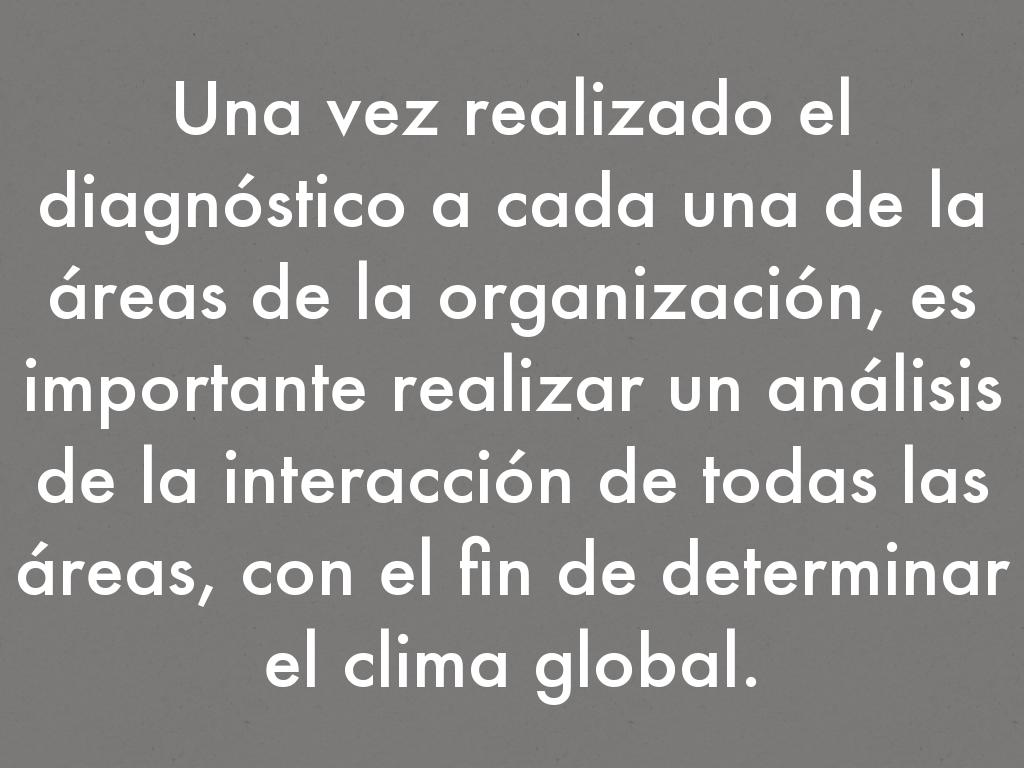 Una vez realizado el diagnóstico a cada una de la áreas de la organización, es importante realizar un análisis de la interacción de todas las áreas, con el fin de determinar el clima global.