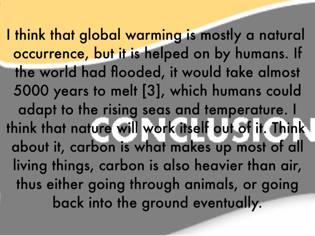 I think that global warming is mostly a natural occurrence, but it is helped on by humans. If the world had flooded, it would take almost 5000 years to melt [3], which humans could adapt to the rising seas and temperature. I think that nature will work itself out of it. Think about it, carbon is what makes up most of all living things, carbon is also heavier than air, thus either going through animals, or going back into the ground eventually.