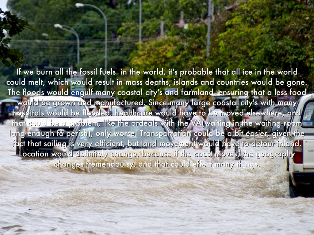 If we burn all the fossil fuels in the world, it's probable that all ice in the world could melt, which would result in mass deaths, islands and countries would be gone. The floods would engulf many coastal city's and farmland, ensuring that a less food would be grown and manufactured. Since many large coastal city's with many hospitals would be flooded, healthcare would have to be moved elsewhere, and that could be a problem, like the ordeals with the VA(waiting in the waiting room long enough to perish), only worse. Transportation could be a bit easier, given the fact that sailing is very efficient, but land movement would have to detour inland. Location would definitely change, because if the coast moves, the geography changes tremendoulsy, and that could effect many things.