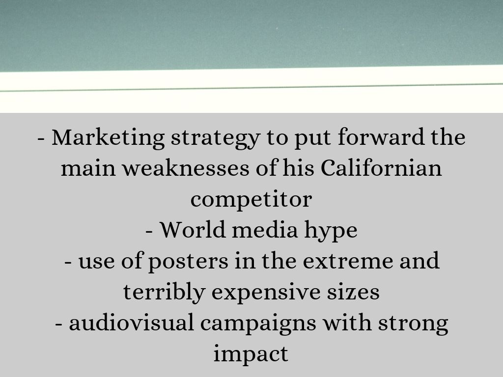 - Marketing strategy to put forward the main weaknesses of his Californian competitor - World media hype - use of posters in the extreme and terribly expensive sizes - audiovisual campaigns with strong impact