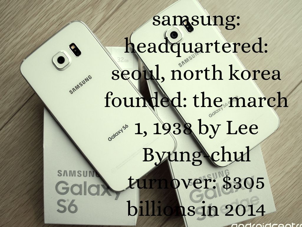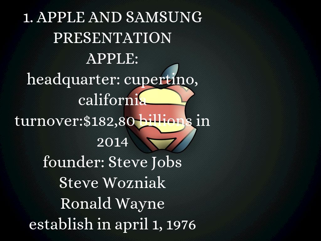 1. APPLE AND SAMSUNG PRESENTATION APPLE: headquarter: cupertino, california turnover:$182,80 billions in 2014 founder: Steve Jobs Steve Wozniak Ronald Wayne establish in april 1, 1976