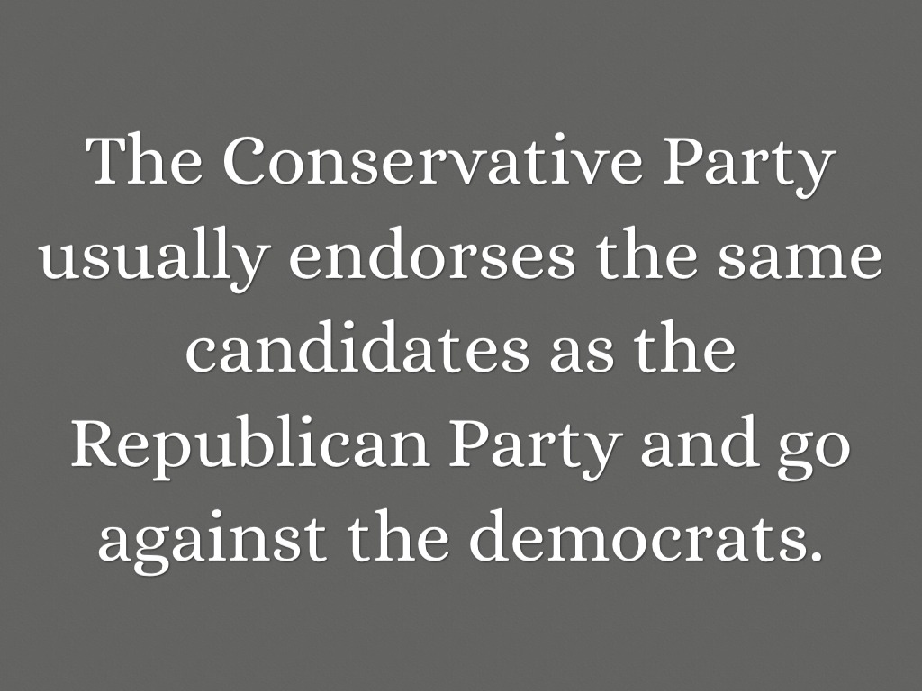 The Conservative Party usually endorses the same candidates as the Republican Party and go against the democrats.