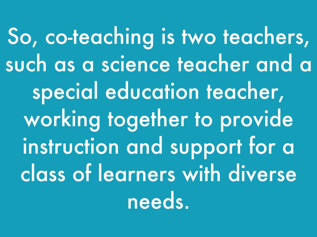 So, co-teaching is two teachers, such as a science teacher and a special education teacher, working together to provide instruction and support for a class of learners with diverse needs.