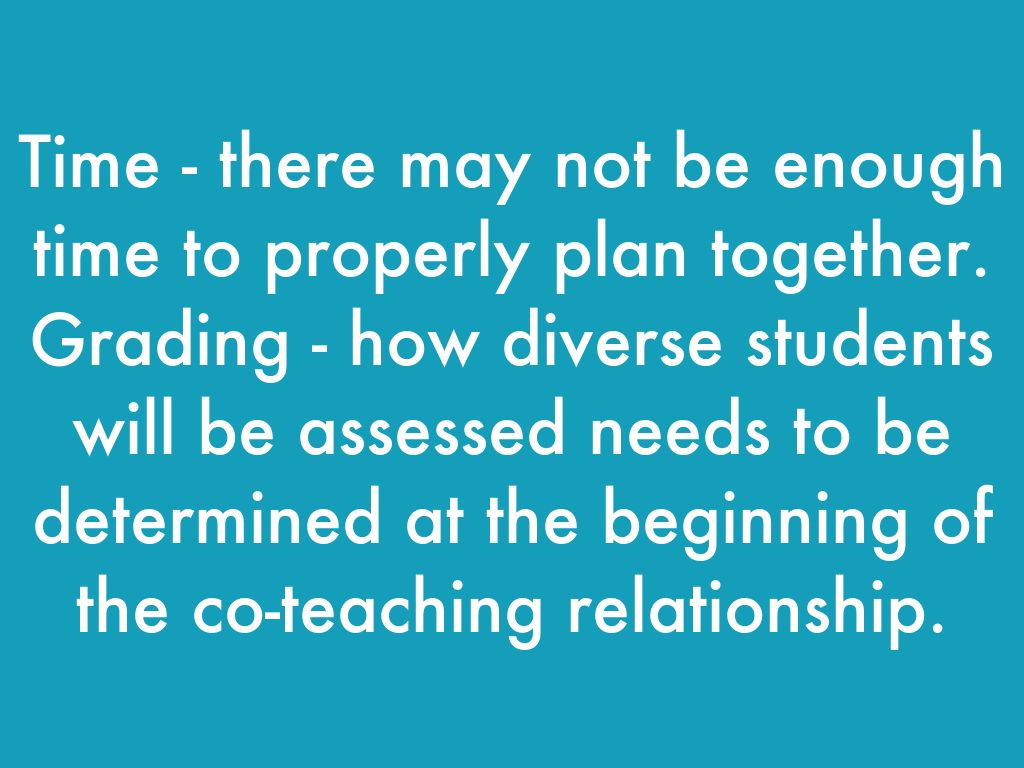 Grading - how diverse students will be assessed needs to be determined at the beginning of the co-teaching relationship.