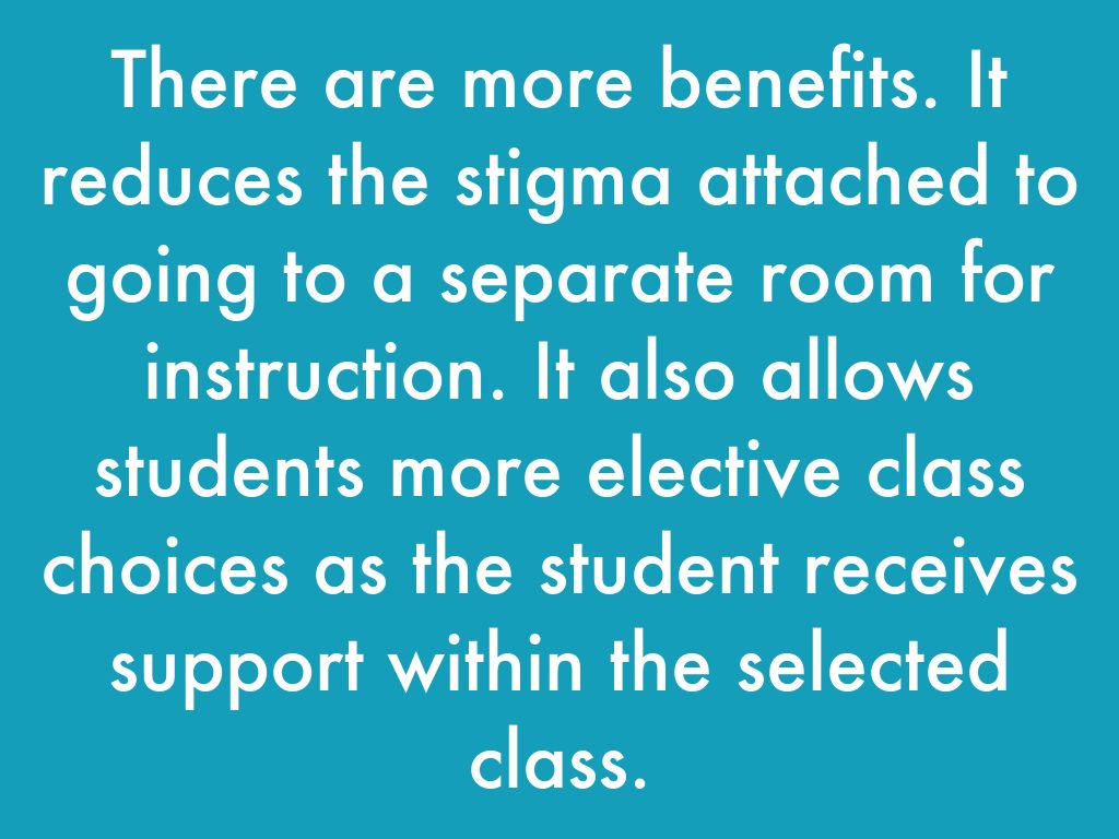 There are more benefits. It reduces the stigma attached to going to a separate room for instruction. It also allows students more elective class choices as the student receives support within the selected class.