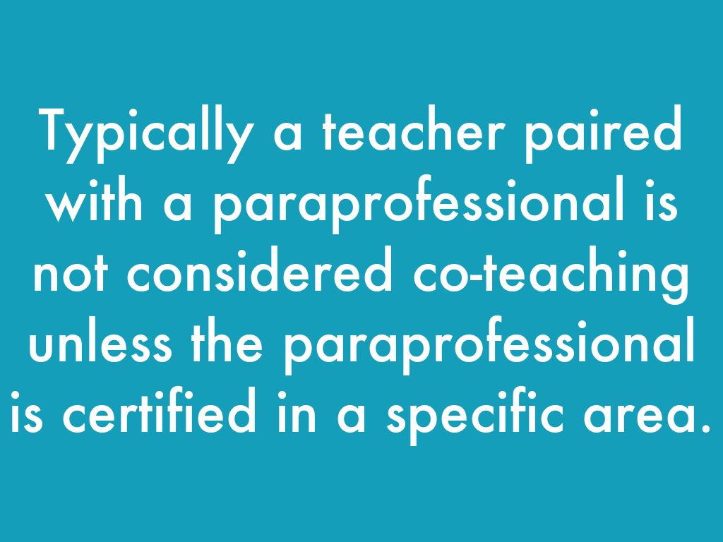 Typically a teacher paired with a paraprofessional is not considered co-teaching unless the paraprofessional is certified in a specific area.