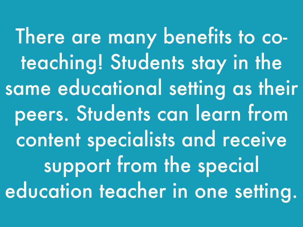 There are many benefits to co-teaching! Students stay in the same educational setting as their peers. Students can learn from content specialists and receive support from the special education teacher in one setting.