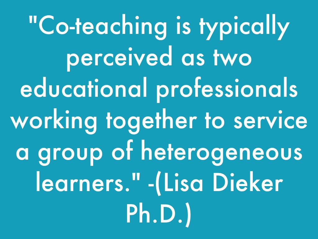 "Co-teaching is typically perceived as two educational professionals working together to service a group of heterogeneous learners." -(Lisa Dieker Ph.D.)