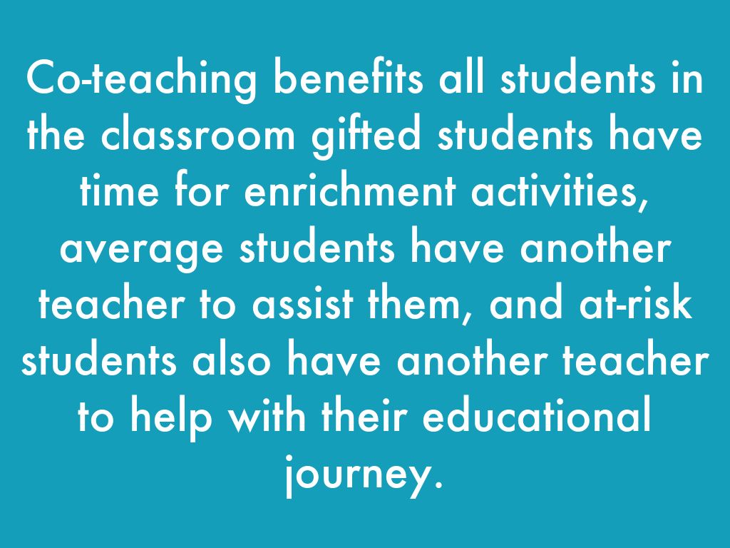 Co-teaching benefits all students in the classroom gifted students have time for enrichment activities, average students have another teacher to assist them, and at-risk students also have another teacher to help with their educational journey.
