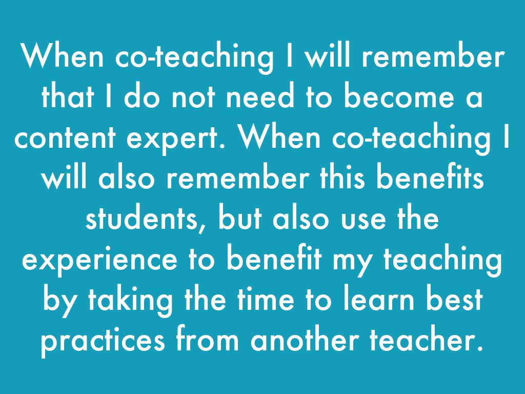 When co-teaching I will remember that I do not need to become a content expert. When co-teaching I will also remember this benefits students, but also use the experience to benefit my teaching by taking the time to learn best practices from another teacher.