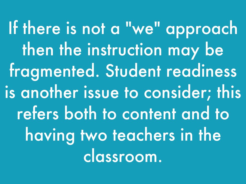 If there is not a "we" approach then the instruction may be fragmented. Student readiness is another issue to consider; this refers both to content and to having two teachers in the classroom.