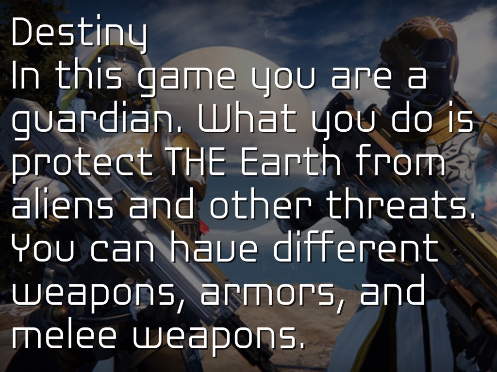 In this game you are a guardian. What you do is protect THE Earth from aliens and other threats. You can have different weapons, armors, and melee weapons.