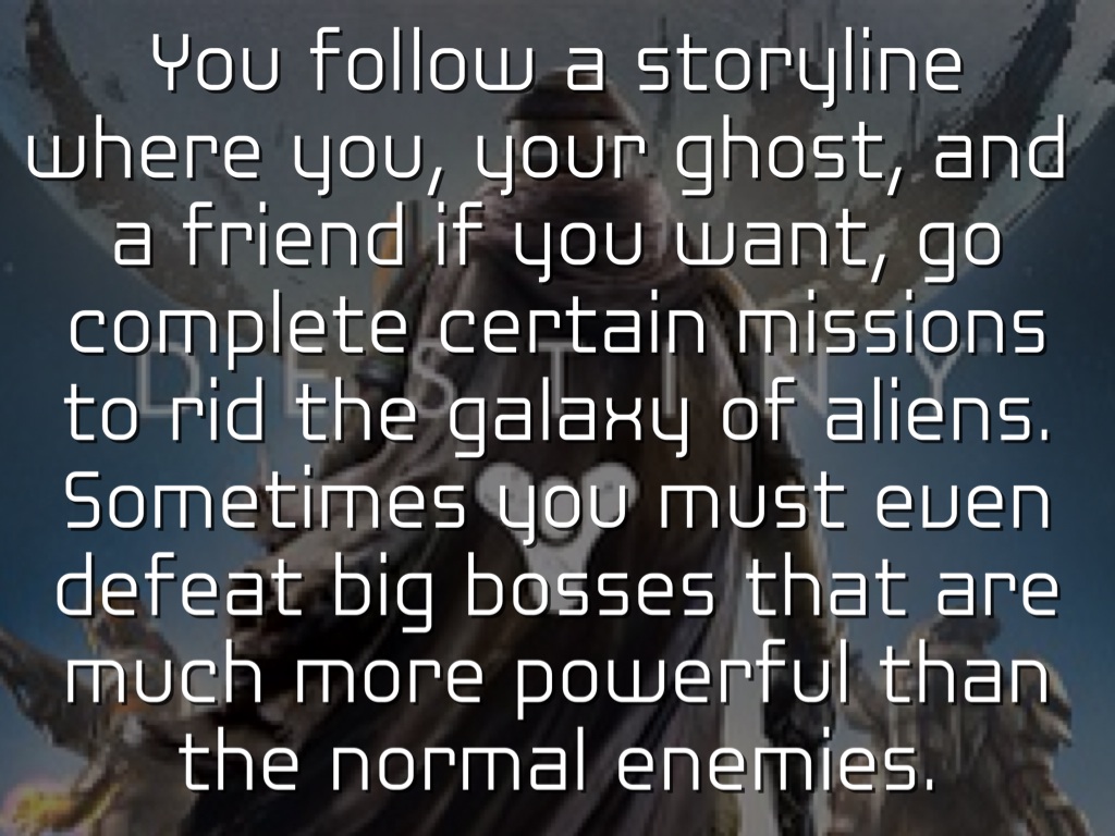 You follow a storyline where you, your ghost, and a friend if you want, go complete certain missions to rid the galaxy of aliens. Sometimes you must even defeat big bosses that are much more powerful than the normal enemies.
