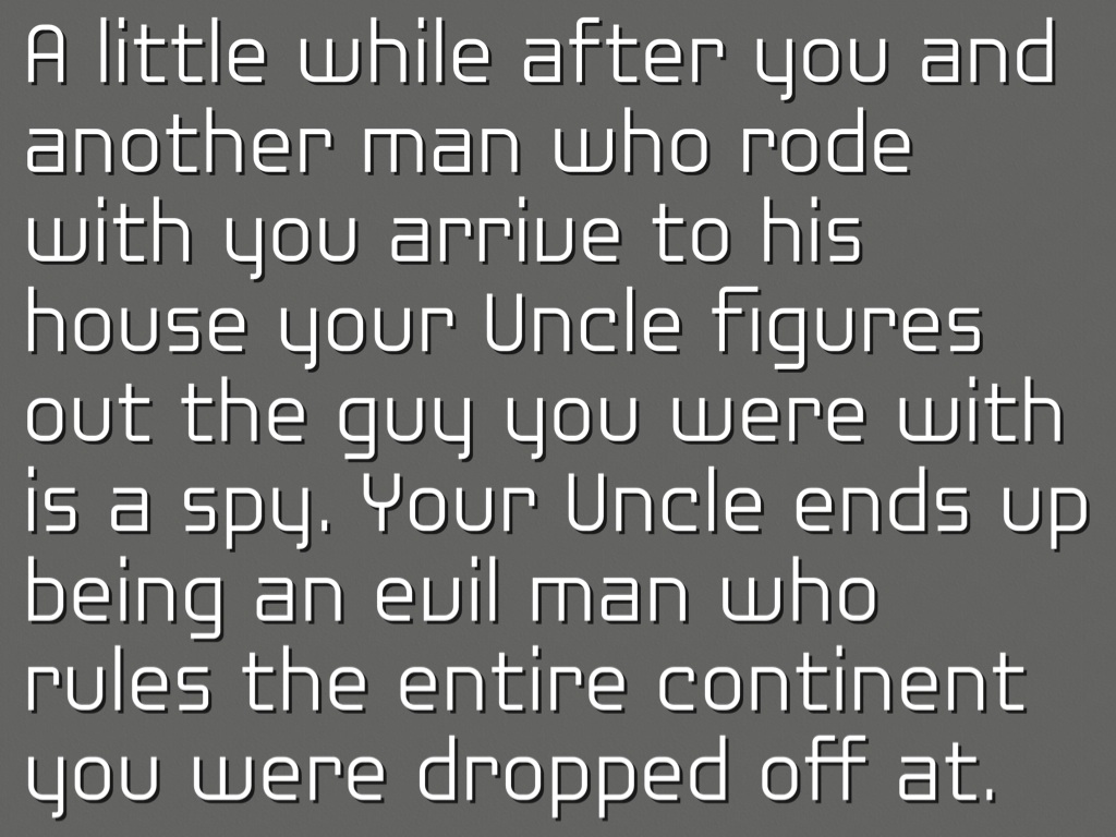 A little while after you and another man who rode with you arrive to his house your Uncle figures out the guy you were with is a spy. Your Uncle ends up being an evil man who rules the entire continent you were dropped off at.